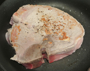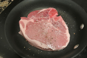 Heat a skillet over high heat. Season chops with salt & pepper on both sides. Brown chop quickly in hot pan, 1 minute.