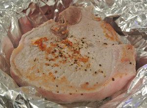 Turn chop and brown the other side. Transfer to a foil lined pan or dish just slightly larger than your chop.