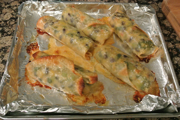 - In a large bowl mix together corn, beans, spinach, cheese, chiles, onions, cumin, chili powder, salt and cayenne pepper. Spoon a good amount of filling onto the wrapper, on the diagonal, slightly below center. Fold sides in and fold bottom over filling and roll tightly. Wet your finger with water and dab a bit on the corner to seal the egg roll. Repeat with remaining wrappers and filling, placing them slightly apart on the baking sheet.