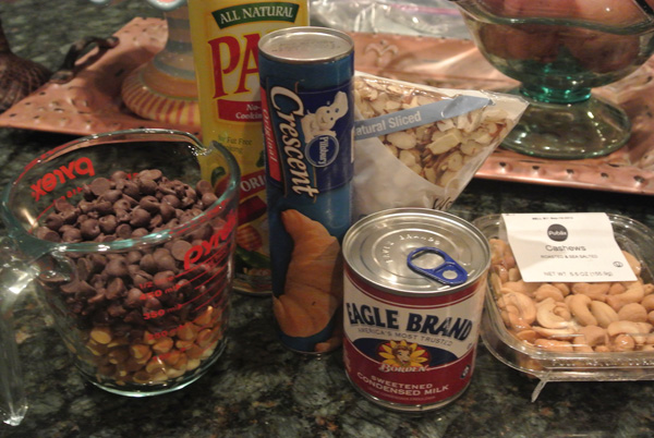 Filed under easy peasy, gifts from the kitchen, recipe box · Tagged with bars, cashews, chocolate, chocolate chips, cookies, crescent rolls, dessert, easy, gift idea, nuts, sweetened condensed milk