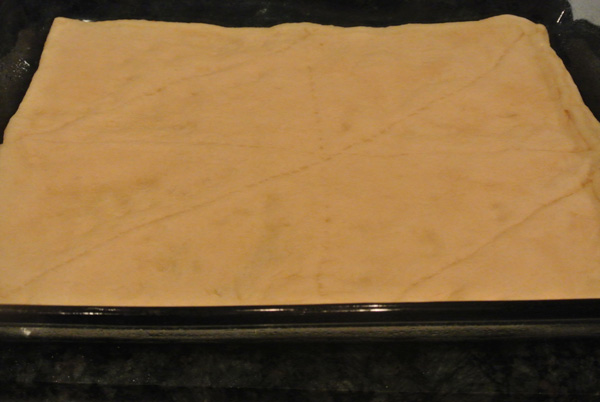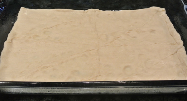 - Carefully unroll crescent roll dough and lay into pan, sealing perforations and pressing dough into pan to form crust.