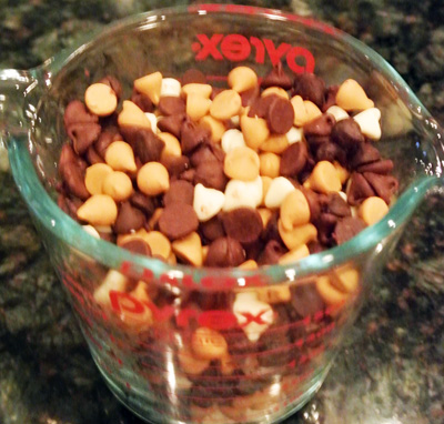 You can use whatever chocolate you have on hand, just make it about 2 cups. On this particular day I had some butterscotch, white, milk chocolate and dark chocolate leftovers, combined made exactly 2 cups without having to open another package. I love when that happens.