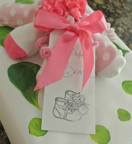 I made a gift tag with a blank luggage tag from the craft store and a baby shoe stamp