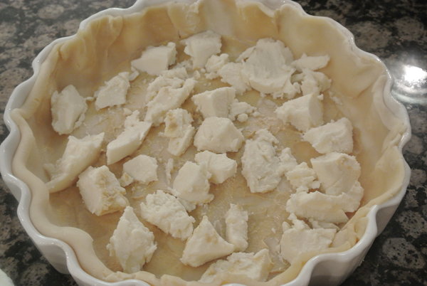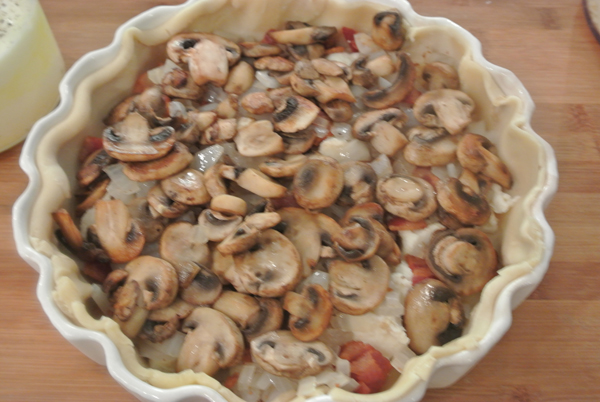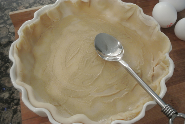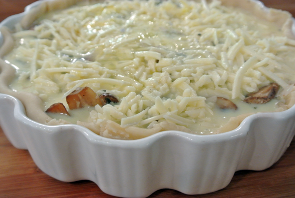 I used the refrigerated pie crust dough from Pillsbury, it is such a time saver.  I recommend pre-baking your crust before filling, it prevents it from getting soggy.  I skipped that step however, because I wanted to see if it makes a difference…it does! Next time I will pre-bake!  The mustard does help though, it forms a barrier between the liquid filling and the dough, plus adds flavor.  So plop some [1-2 T] in the crust and spread it around.