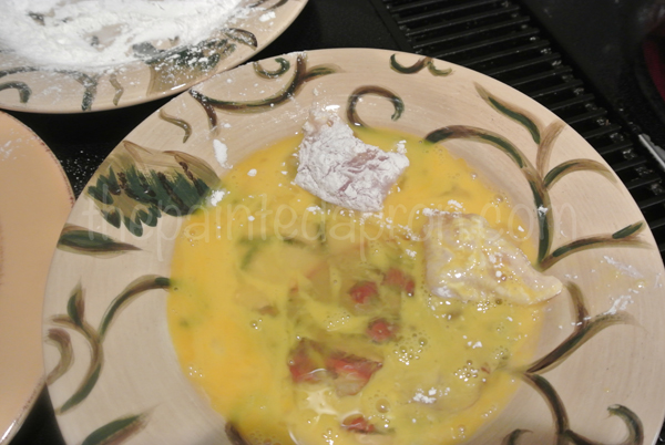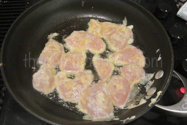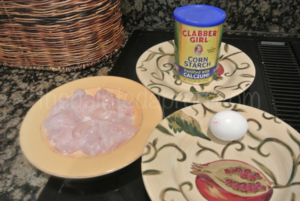 - Dip chicken into cornstarch and coat all the way and then into eggs.