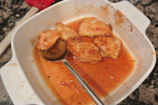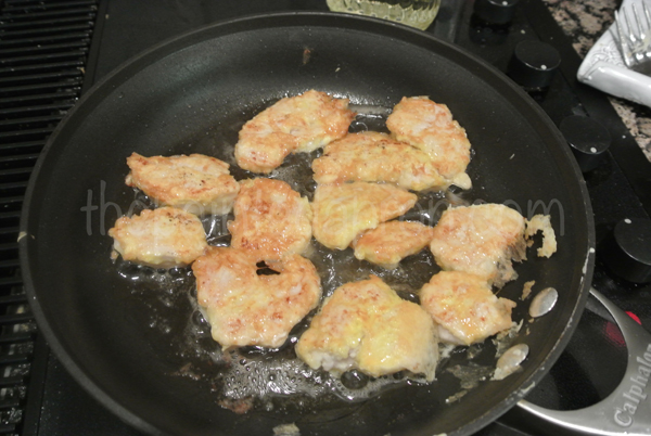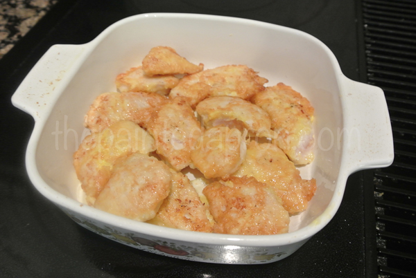 When the chicken is golden on both sides transfer the pieces to a baking dish that has been sprayed with cooking oil spray.