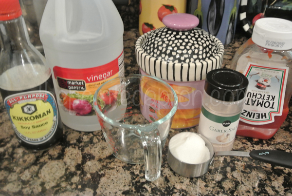 I am pretty sure you have all these ingredients, Soy sauce, vinegar, sugar, garlic salt and ketchup