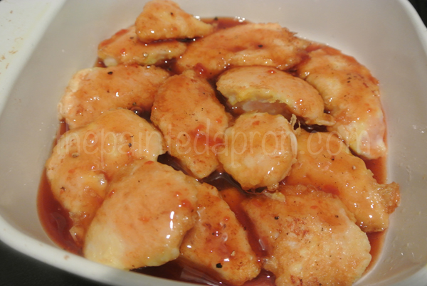 - Rinse chicken, trim off fat and then cut into 1 inch cubes. season with salt and pepper. Place in greased baking dish. Top with sauce