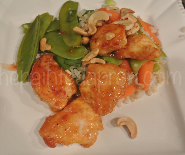 I served this with some brown rice, carrots and snow peas, and sprinkled some cashew pieces on top