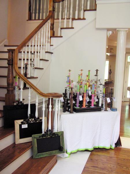 This photo is from a different show, and it demonstrates this artist’s sophisticated display. Her subtle lime green polka dot cloth is edged with a lime ruffle. The dots are just enough to keep the white from being boring yet don’t distract from her display. She has a black velvet tiered tray to display her colorful jewelry trees which makes them totally pop! Her framed challkboard/bulletin boards are cleverly displayed up the stairs.