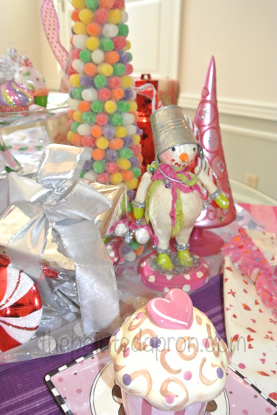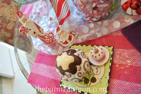 One of my favorite decorating themes at Christmas time is CANDY! Growing up it was all about candy for me, and my mom made me the most wonderful gingerbread house with all the trimmings which she kept in the freezer and brought out every year.  I have been collecting sweets for a while now and I thought it would be fun to kick off the season by making a little candy store tablescape…