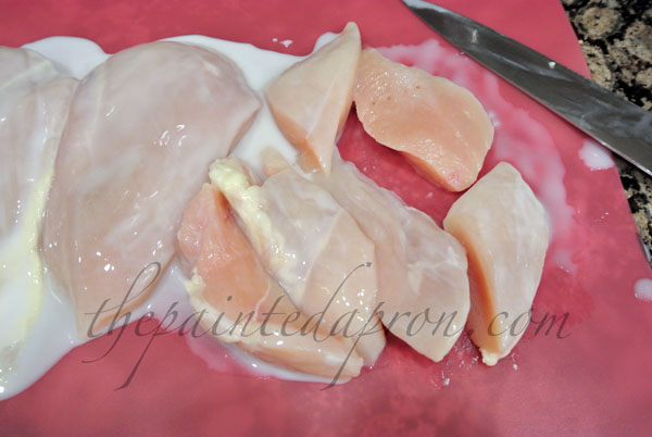 I try to always marinate my chicken in buttermilk for a day or two, which is why is looks a little milky.  The pink mat is a plastic mat that I use to cut raw chicken because it can go straight in the dishwasher when I’m through.