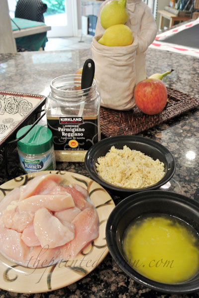 Melt 1/2 stick butter in a shallow bowl.  Mix the ranch dressing mix, Parmesan and crushed chips together in another bowl and set up a dredging station.
