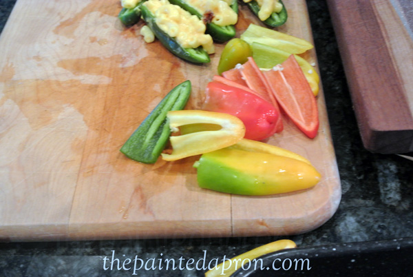 Nobody wanted to spend too much time in the kitchen so we decided to keep it simple Saturday night and grill some shrimp and make some poppers, Southern style, stuffed with macaroni and cheese, don’t cha know…