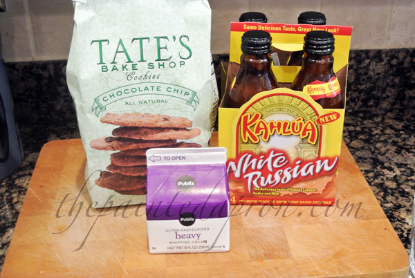 I bought this little pack of White Russian cocktails when the Olympics began thinking they would be fun to sip on during the games and decided to try one in a dessert with Tate’s*  chocolate chip cookies and whipped cream.  You don’t have to use liqueur though, you can use vanilla extract or any flavor that suits you