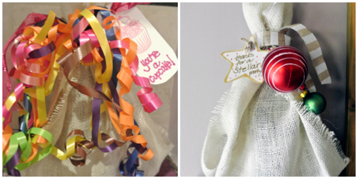 You can grab some ribbon, sparkly garland, even balloons to make a fast a festive bottle wrap