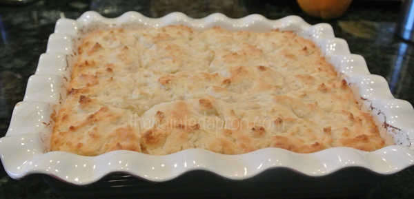• Dip fingertips in flour. Lay the dough on top of the melted butter in the baking dish and gently pat into an even layer over the bottom of the pan.