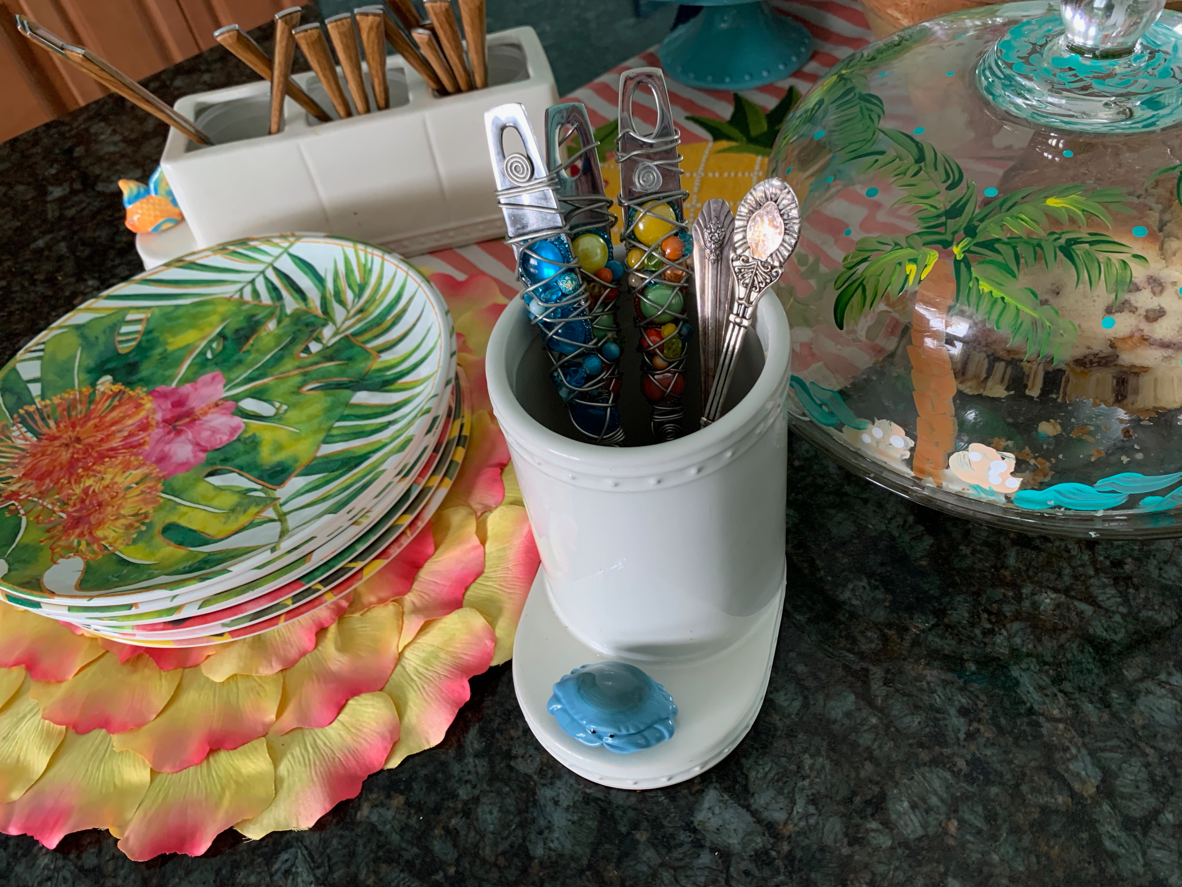 A Nora Fleming utensil caddy with a blue crab holds serving pieces